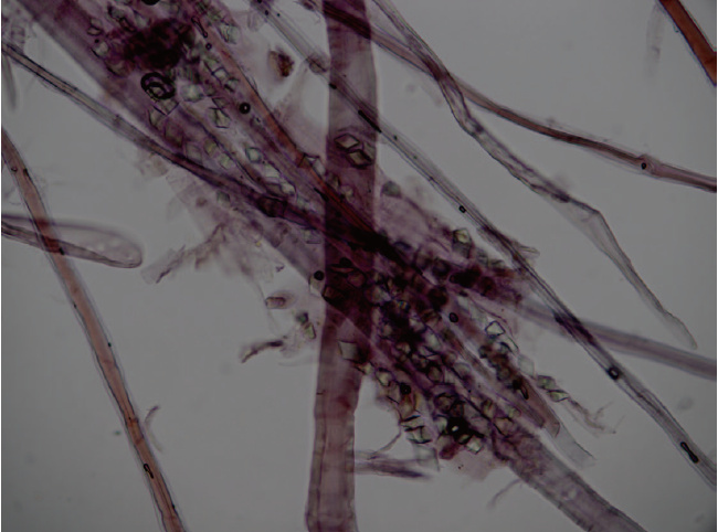 構(gòu)皮紙還有一個非常重要的特征是除纖維細(xì)胞外,紙張纖維中還能見到大量的草酸鈣晶體(如圖4),多呈菱形或者正方形,常存在于薄型細(xì)胞的腔內(nèi)或者細(xì)胞與細(xì)胞之間,造紙過程中的打漿和漂洗程序會使草酸鈣晶體流失,因而一些制作精細(xì)的構(gòu)皮紙中殘留的草酸鈣晶體相對少見。